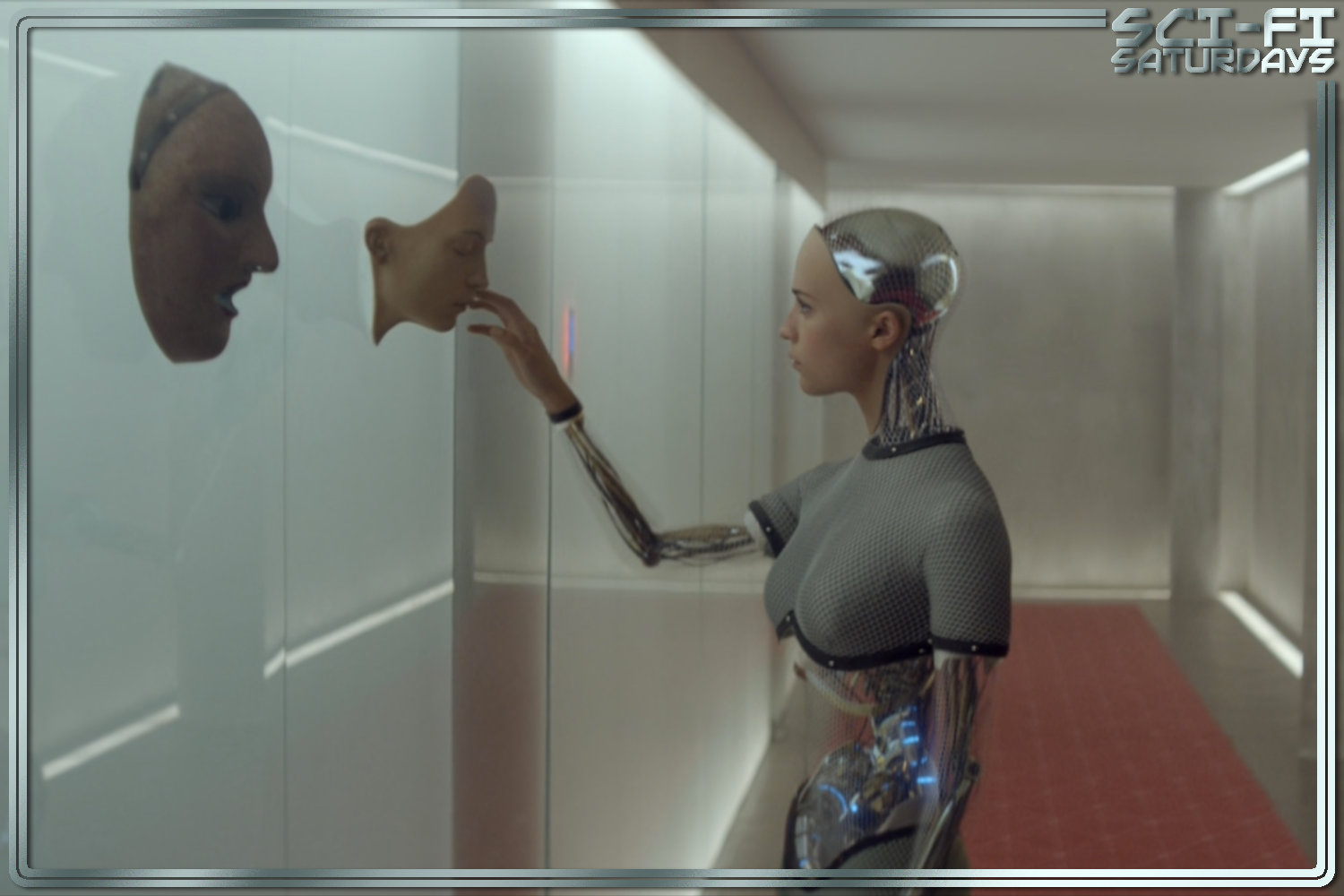 Computer programmer Caleb (Domhnall Gleeson), who works at the search engine Blue Book, wins a staff lottery that gives him a trip to the owner’s massive estate. He gets delivered by helicopter into a field in the middle of nowhere, with no cellular signal, and discovers a small modern house near the river. Inside, he meets Nathan (Oscar Isaac), CEO of Blue Book and a genius inventor, who tells Caleb that he was brought here to share in a research project. But first, Caleb must sign a non-disclosure agreement. Nathan tells Caleb he’s here to administer the Turing Test to a gynoid named Ava (Alicia Vikander). Caleb is escorted into an underground workspace and living quarters, where he can interview Ava through a plexiglass partition. She has a synthetic body, except for her feet, hands, and face, which are covered with what appears to be skin.